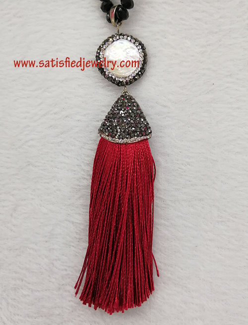Material: Real shell beads with tassel and with crystal stone around shell beads with cyrstal beads Size: 21.5mm Tassel size: 80mm MOQ: 50PCS Delivery time: one week