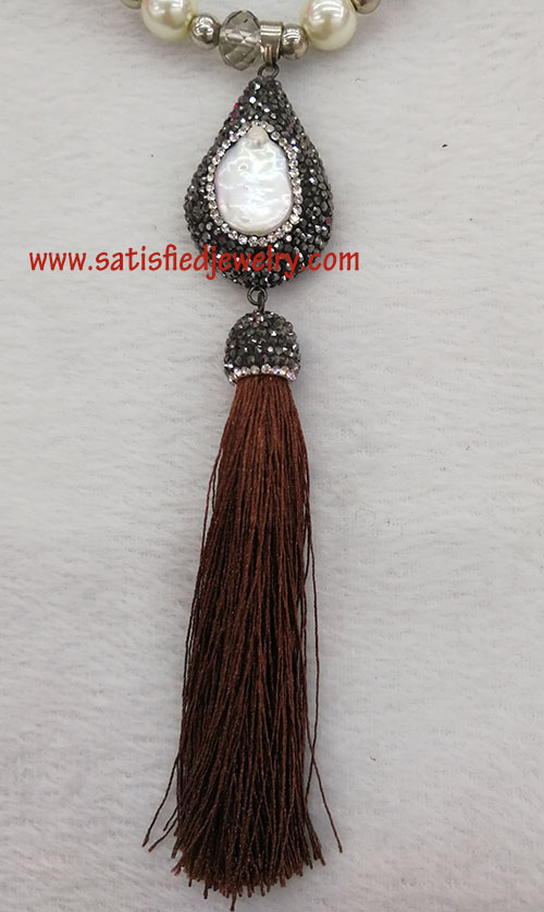 Material: Real shell beads with tassel and with crystal stone around shell beads with crystal beads Size: 44mmx26mmx12mm(depth) Tassel size: 80mm MOQ: 50PCS Delivery time: one week