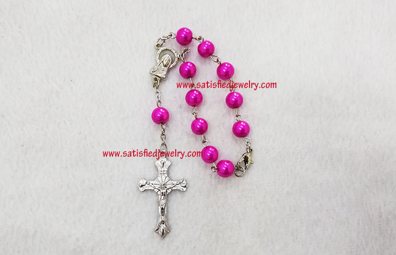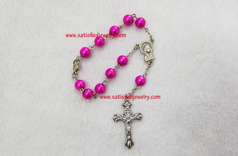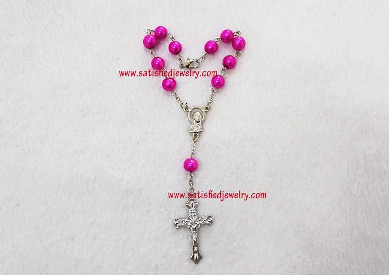 Material: plastic beads + iron rings + Alloy pendant Size: 8.4mm plastic beads, middle alloy pendant size is 18.8x15mm, the below cross pendanty size is 39x23mm, total length is 17cm, only the chain length is 17cm MOQ: 2000pcs/color Delivery time: 10days
