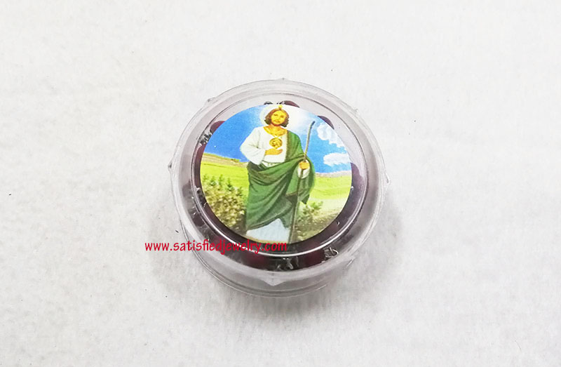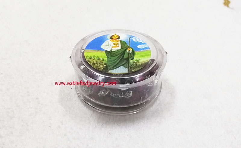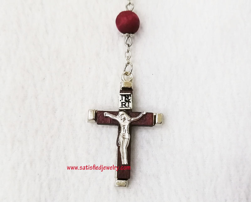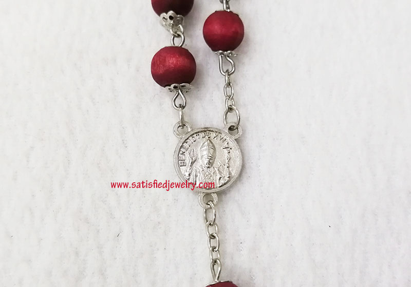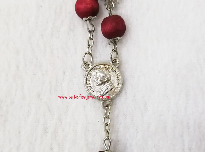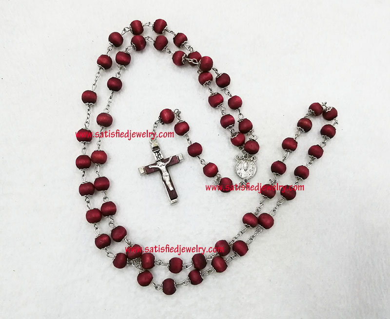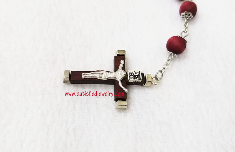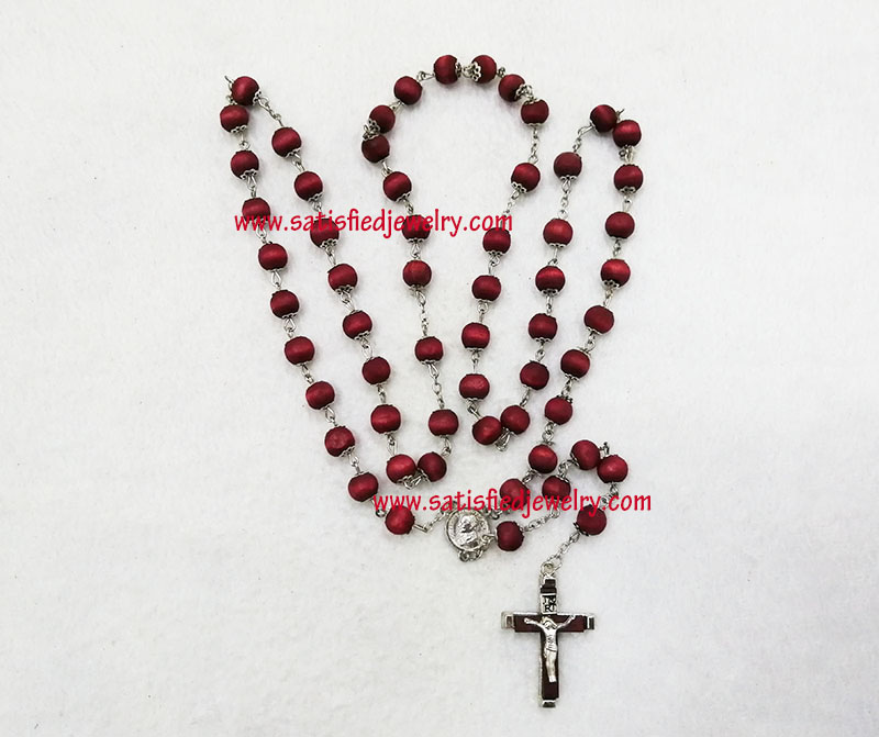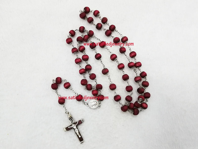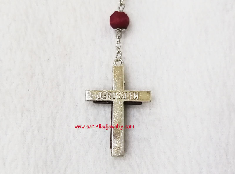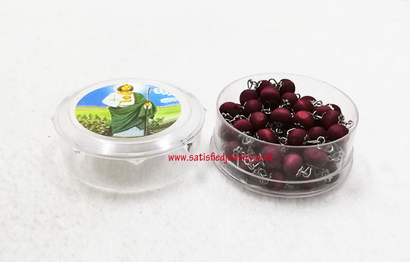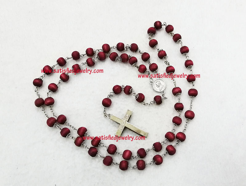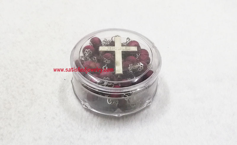 Material: plastic beads + iron rings + Alloy pendant Size: 9mm wood beads, iron flower part size is 6mm, middle alloy pendant size is 18x14mm, the below cross pendanty size is 42.7x28mm , total length is 55cm, only the chain length is 78cm, the plastic box diameter is 63.5mm, the depth of the box is 30.2mm MOQ: 2000pcs/color Delivery time: 10days