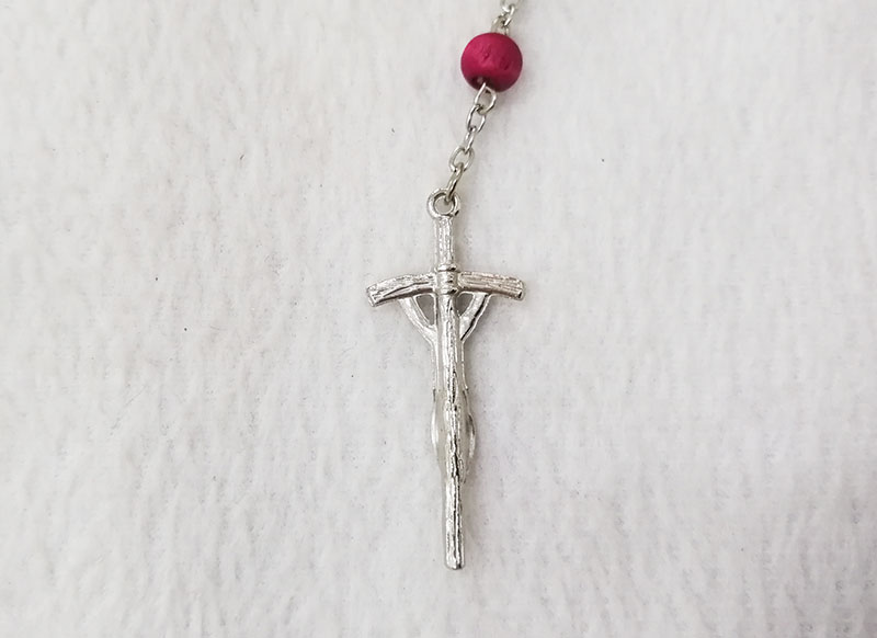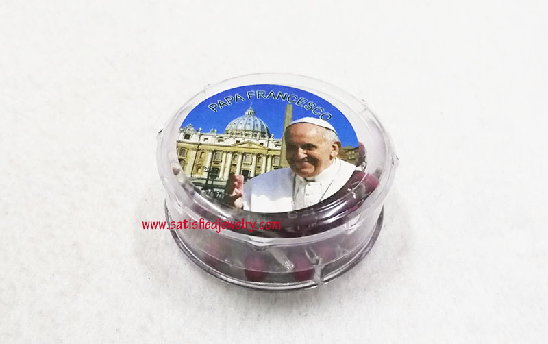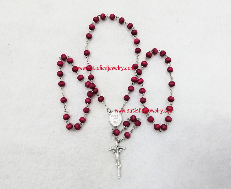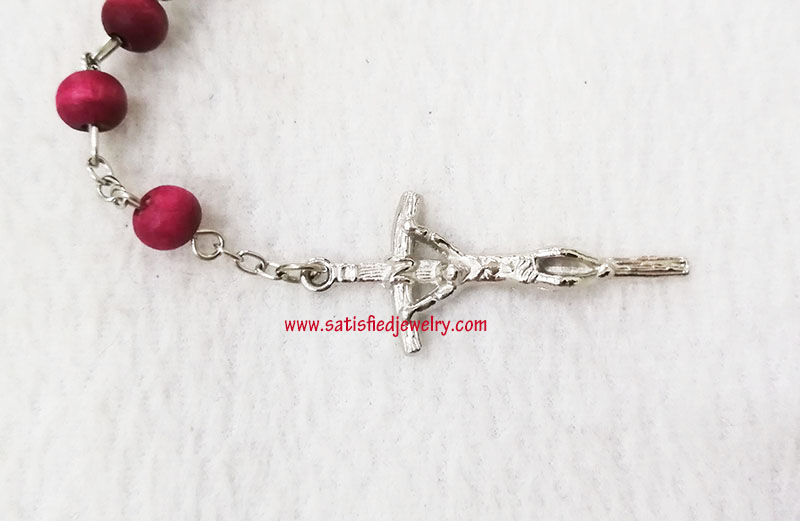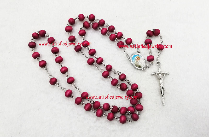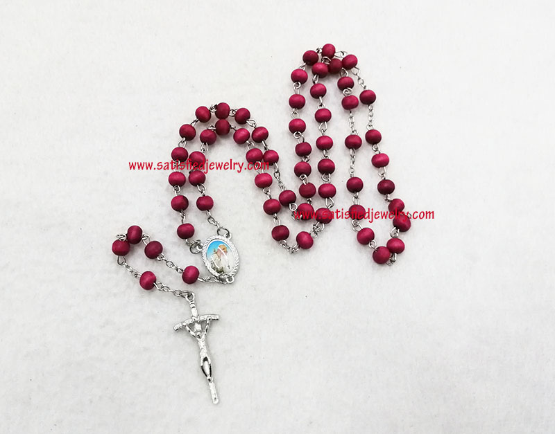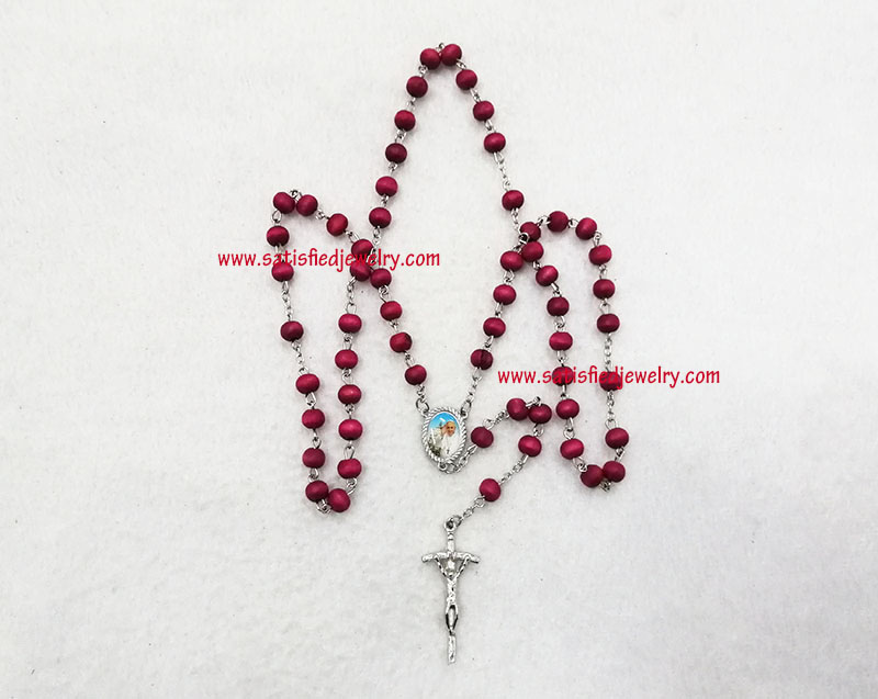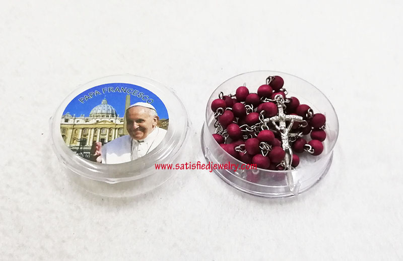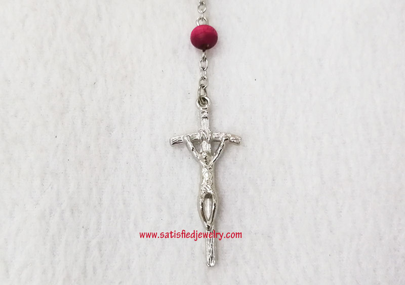 Material: plastic beads + iron rings + Alloy pendant Size: 7.2x5.7mm wood beads, middle alloy pendant size is 20x14.8mm, the below cross pendanty size is 41.2x17.6mm , total length is 48.5cm, only the chain length is 67cm, the box diameter is 58.6mm, the depth of the box is 24mm MOQ: 2000sets/color Delivery time: 10days