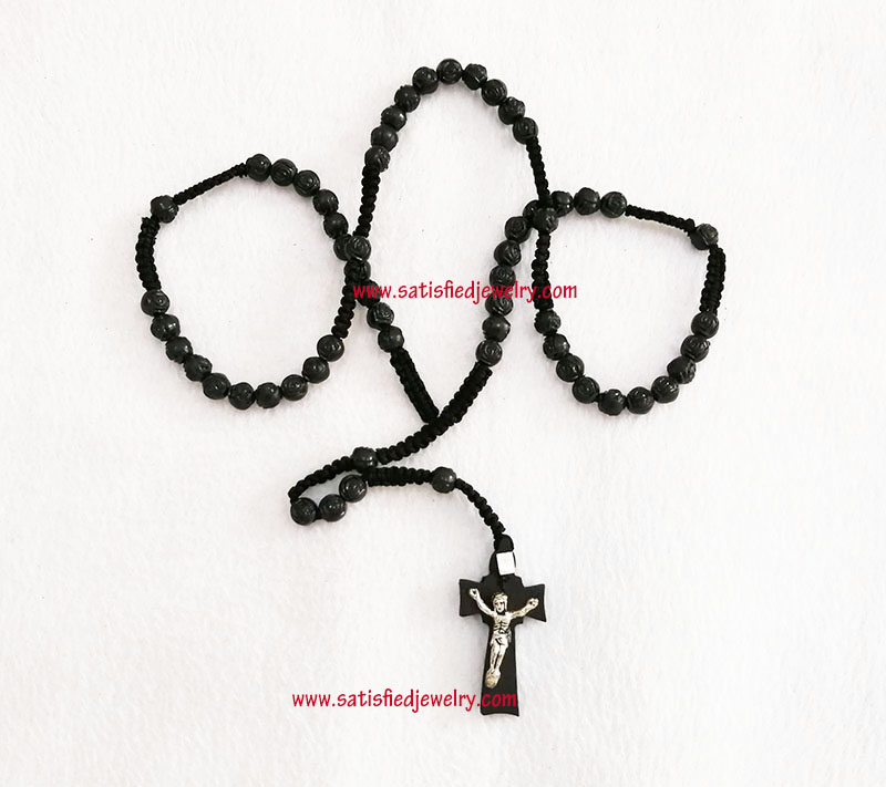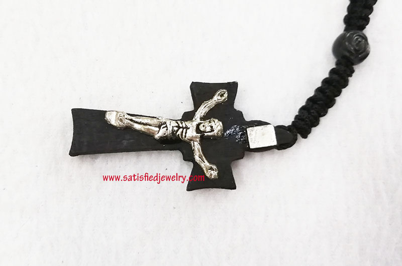 Material: plastic beads + wood cross Size: 8mm plastic beads with flowers on two sides, the below wood cross pendant size is 49x24x4.9mm, total length is 51cm, only the chain length is 66cm MOQ: 2000pcs/color Delivery time: 10days
