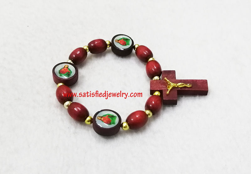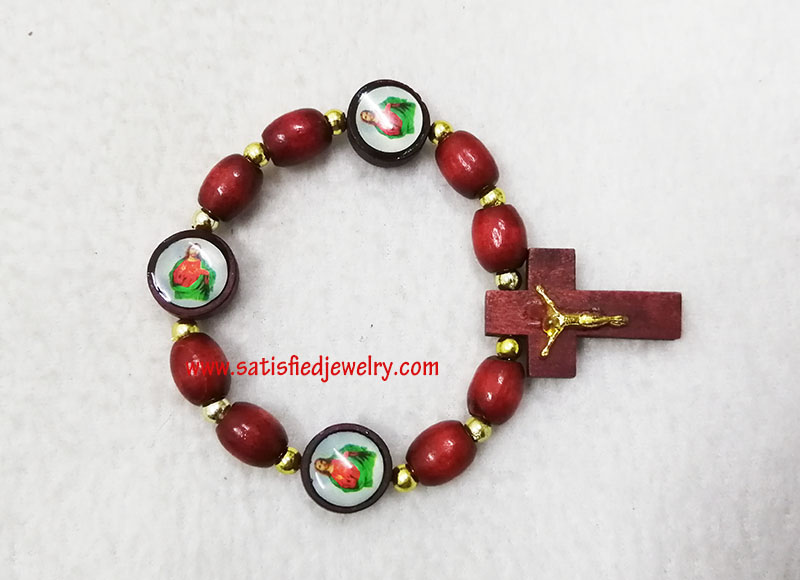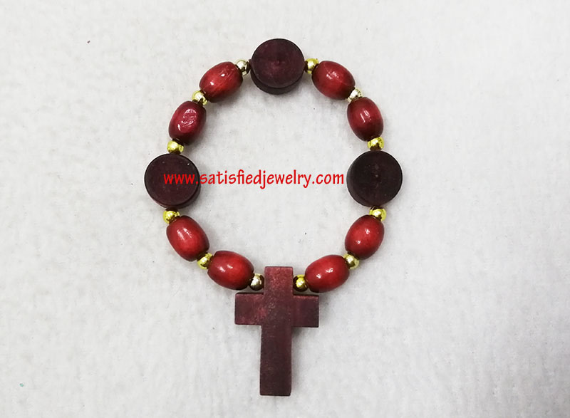 Material: wood + gold color plastic beads Size: 9.6x8mm wood beads, 13x12.6x6.3mm wood round beads, 28x18.8x4.3mm wood cross pendant, 3.8mm plastic round beads with gold color MOQ: 2000pcs/color Delivery time: 10days