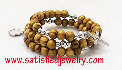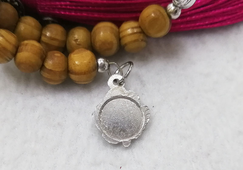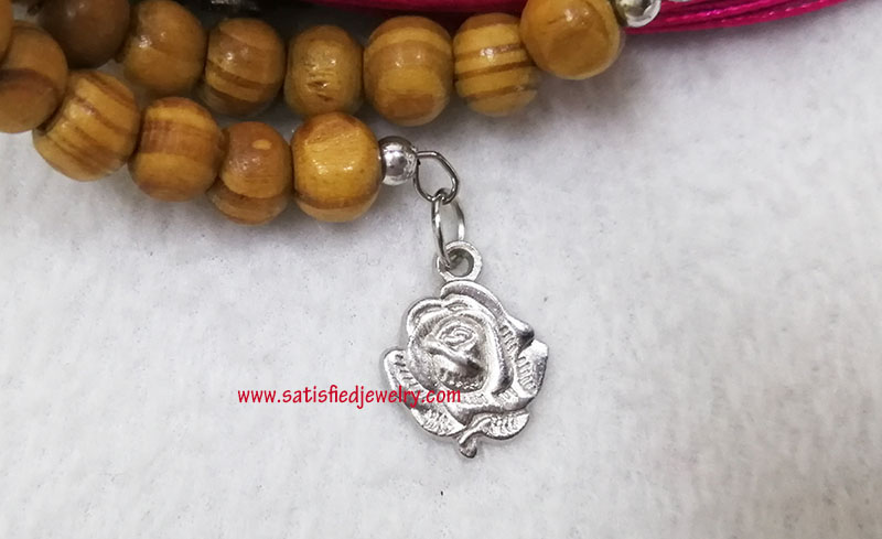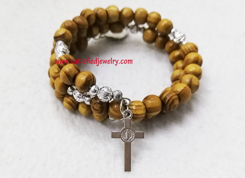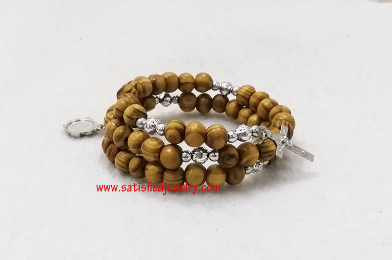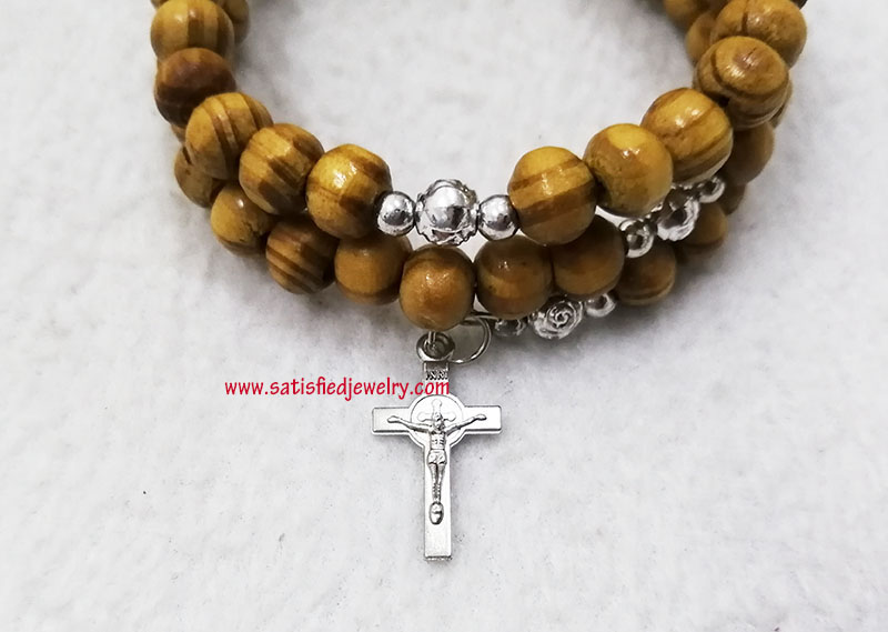 Material: Wood beads + silver color Plastic beads + alloy pendant Size: 8mm wood beads, 5.7mm plastic beads with flower on two sides, 4mm plastic round beads, alloy rose size is 18x13.8mm, alloy cross size is 23.2x12.4mm MOQ: 3000pcs Delivery time: 10days