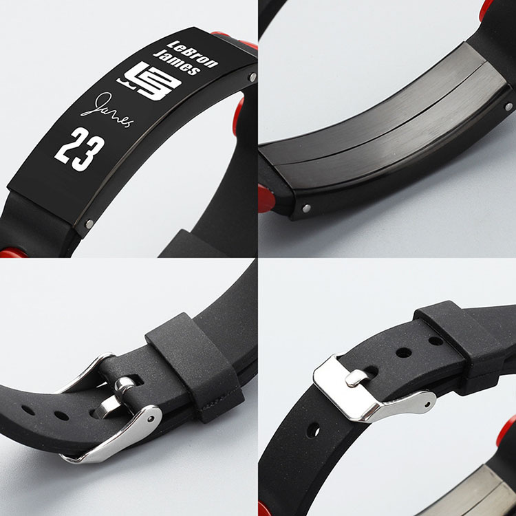 Material: Stainless steel + genuine silicone Color: black / blue / red / yellow / white / orange / green / light blue Size: length is 23cm, width is 17mm, perimeter is from 18cm ro 22cm, with 6 holes on the silicone belt MOQ: 100pcs/color Delivery time: one week
