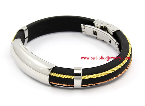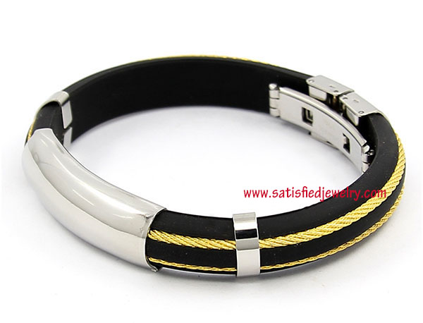 Material: Stainless steel + genuine silicone Color: botrh silver / both gold / both rose gold / one gold one rose gold Size: width is 11mm, depth is 3.5mm, length of the middle steel part is 38mm MOQ: 100pcs/color Delivery time: one week