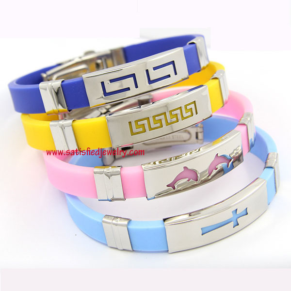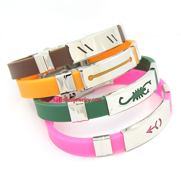 Material: Stainless steel + genuine silicone Color: many colors as show in the photo Size: length is 21cm, width is 10mm, the silicone belt size is 10x3mm, middle steel part size is 38x10x3.5mm MOQ: 100pcs/constellation Delivery time: one week