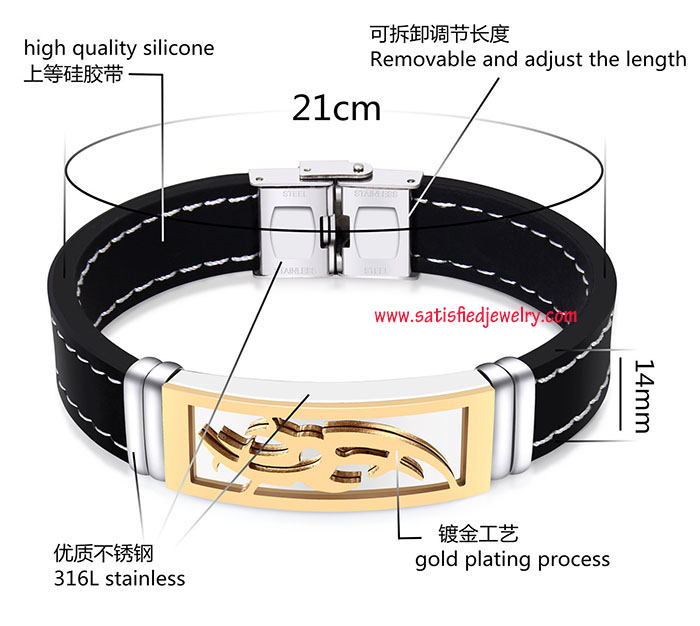 Material: Stainless steel + genuine silicone Color: with totally 48designs, each design with 4 colors black / silver / gold / rose gold Size: length is 21cm, width is 14mm MOQ: 100pcs/color / design Delivery time: one week