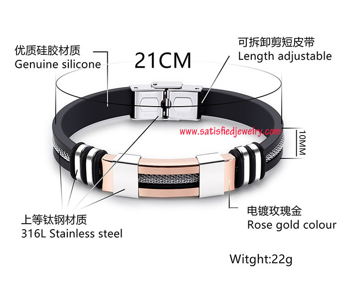 Material: Stainless steel + genuine silicone Color: as show in the photo Size: length is 21cm, width is 10mm MOQ: 100pcs Delivery time: one week
