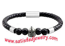 Material: Leather + tiger eye + agate matt +lava + middle brass part Color: gold / silver / black Size: 8mm gemstone round beads Weight: 14g MOQ: 120pcs/color Delivery time: one week