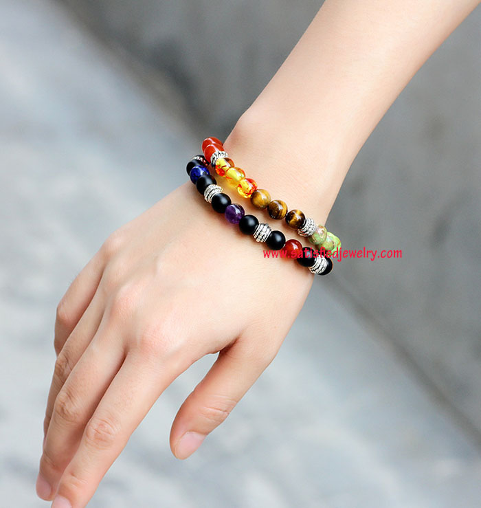 Material: colored gemstone beads + alloy parts Color: two colors - all colored gemstone beads / colored genstone beads + black agate matt Size: 8mm gemstone beads, diameter is 6cm Weight: 20g MOQ: 120pcs/color Delivery time: one week