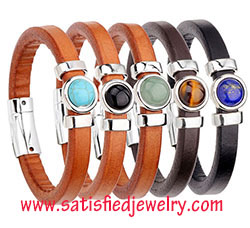 Material: Leather + alloy parts Color: dark brown + tiger eye / dark brown + lapid / light brown + turquoise / light brown + black agate / light brown + aventurne Size: length is 23.5cm, width is 1cm Weight: 31g MOQ: 120pcs/color Delivery time: one week