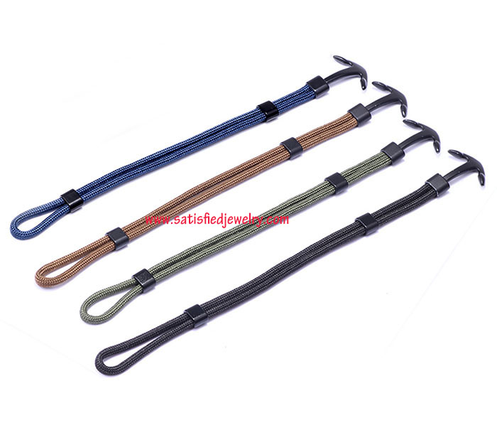 Material: Polyester rope + alloy parts Color: black / green / brown / blue / blue camouflage / green camouflage Size: length is 21cm Weight: 10g MOQ: 120pcs/color Delivery time: one week