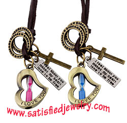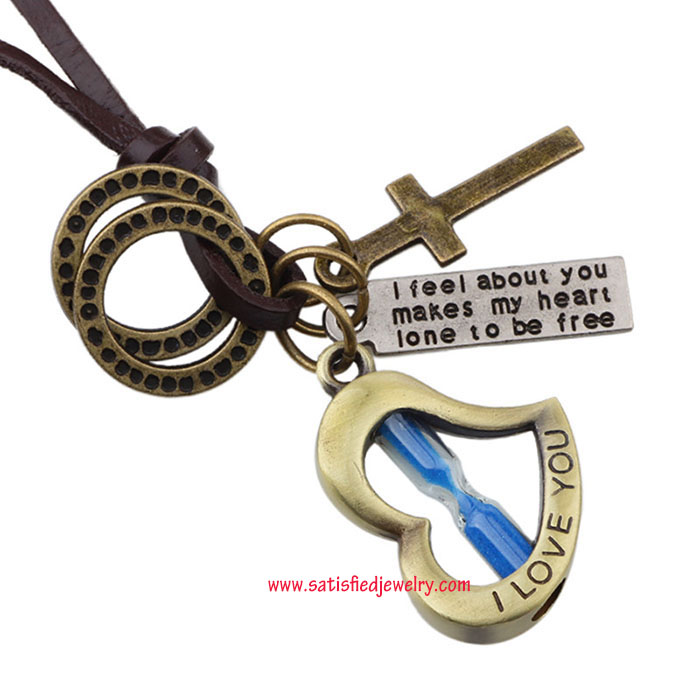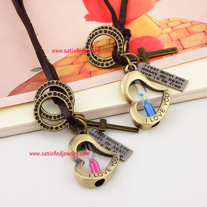 Material: Leather + alloy parts + hour glass Color: pink sand / blue sand Size: Leather rope perimeter is 72cm Weight: 20g MOQ: 120pcs/color Delivery time: one week