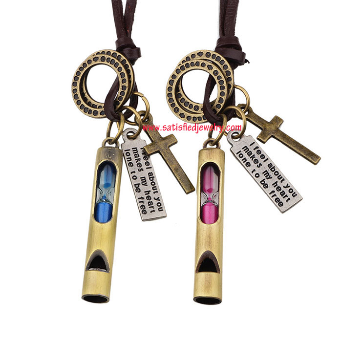 Material: Leather + alloy parts + hour glass Color: pink sand / blue sand Size: Leather rope perimeter is 72cm Weight: 20g MOQ: 120pcs/color Delivery time: one week