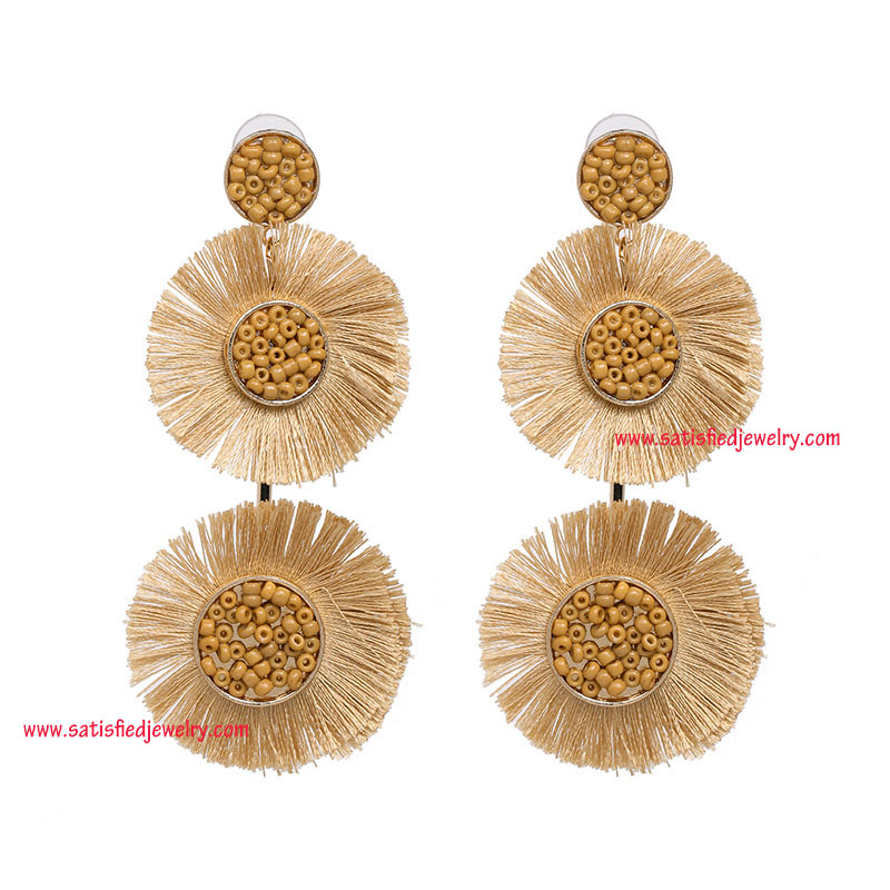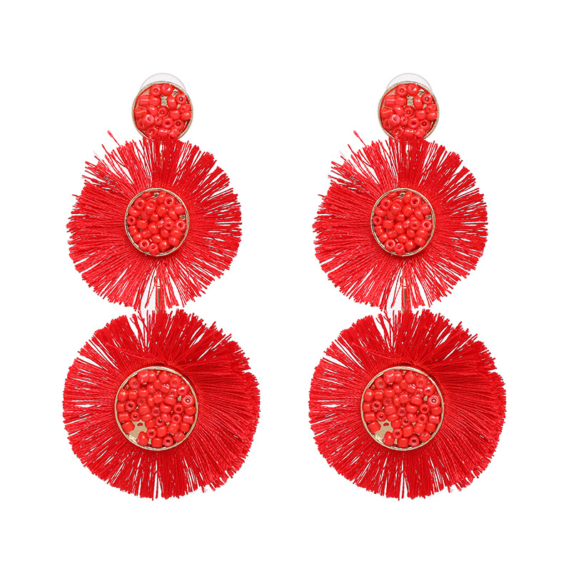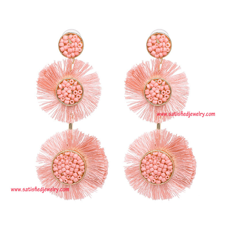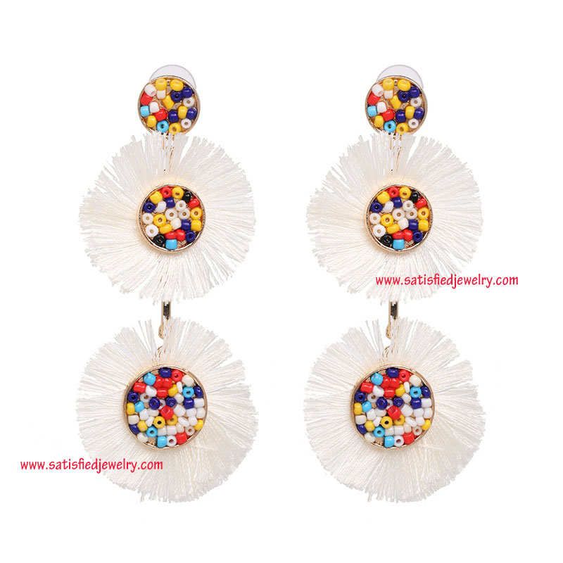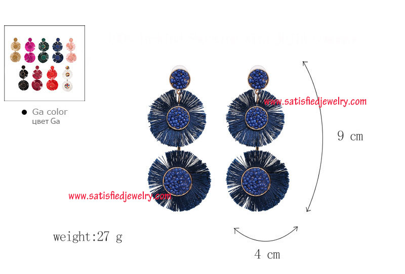 Material: Tassel + alloy parts Color: white / red / green / blue / black / rose / pink / light pink / brown Size: 4x9cm Weight: 27g MOQ: 120pairs/color Delivery time: one week