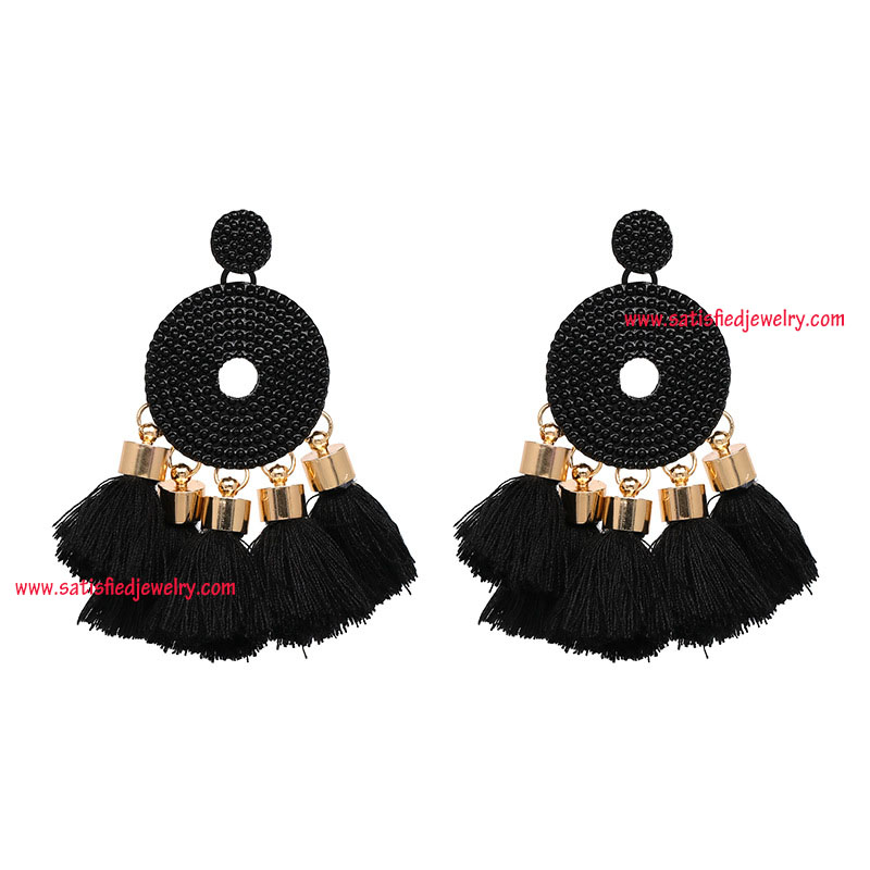 Material: Tassel + alloy parts Color: red / blue / black / brown / pink / cream Size: 6.5x7.5cm Weight: 27g MOQ: 120pairs/color Delivery time: one week