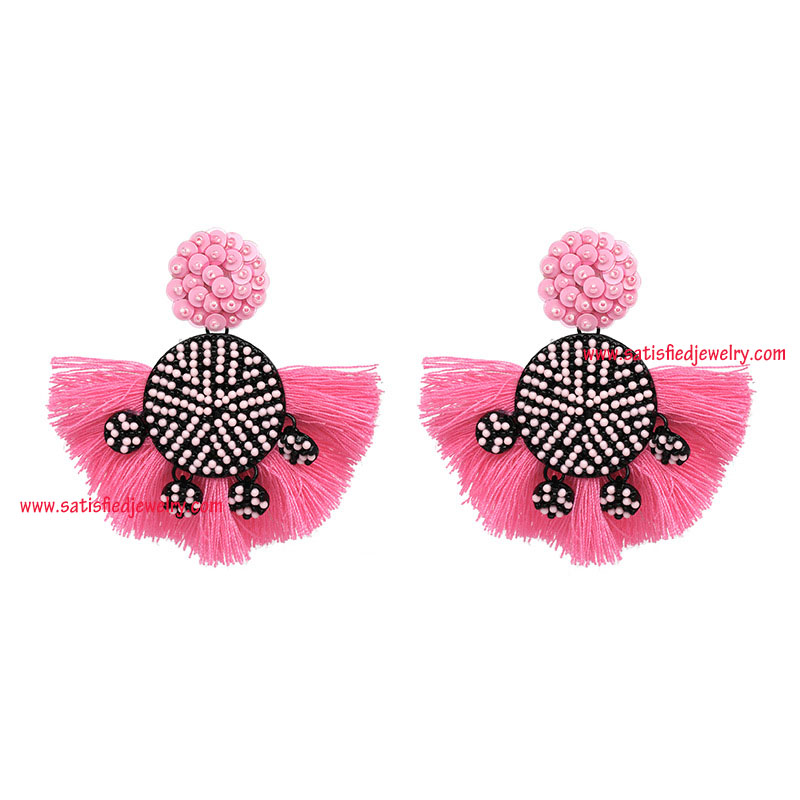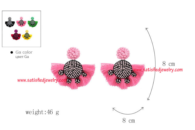 Material: Tassel + alloy parts Color: black / fuchsia / red / yellow / green Size: 8x8cm Weight: 46g MOQ: 120pairs/color Delivery time: one week