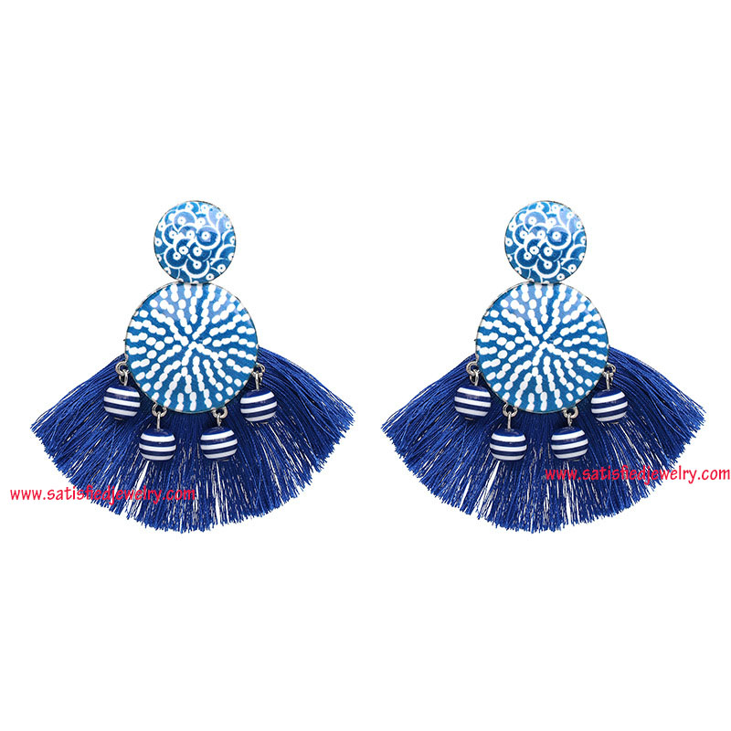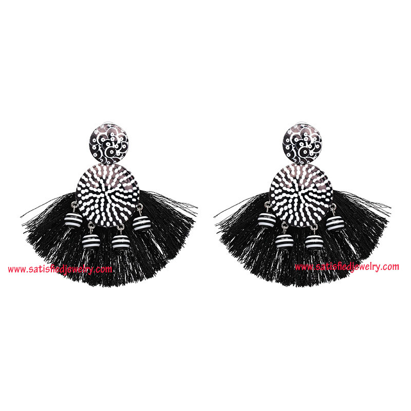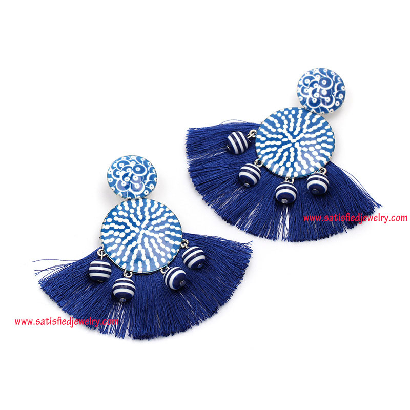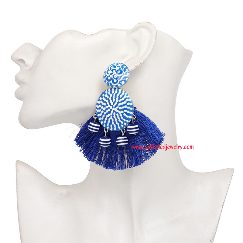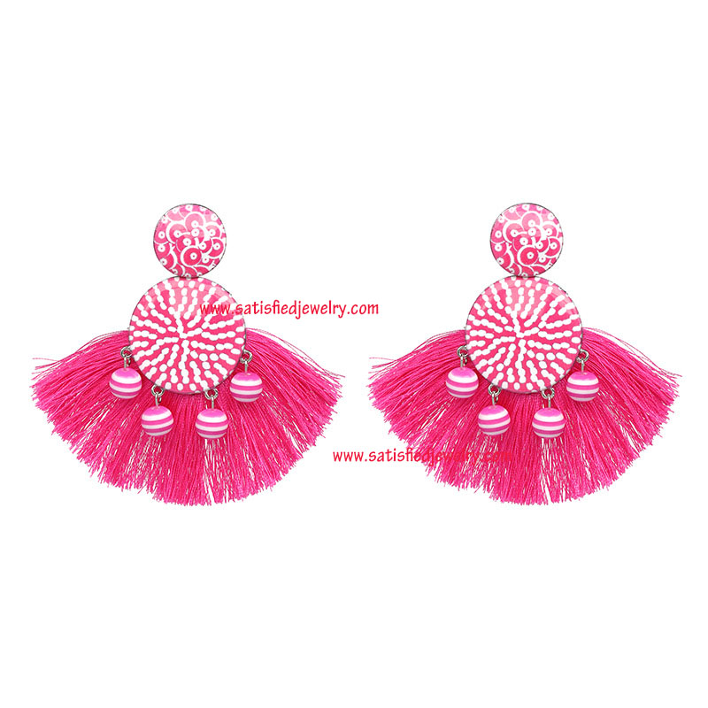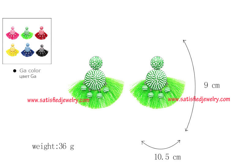 Material: Tassel + alloy parts Color: fuchsia / red / green / yellow / blue / black Size: 10.5x9cm Weight: 36g MOQ: 120pairs/color Delivery time: one week