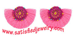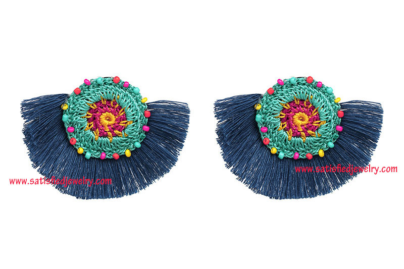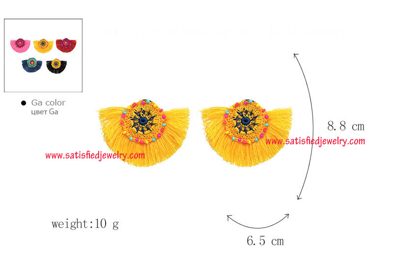 Material: Tassel + alloy parts Color: fuchsia / yellow / red / blue / black Size: 8.8x6.5cm Weight: 10g MOQ: 120pairs/color Delivery time: one week