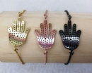 Material: Brass with real gold plated, with cubic zircon Color: Gold plated, Rose gold plated, Black color, Rhodium plated Size: 28x15.7mm Weight: 3.9g MOQ: 50PCS each color Delivery time: one week