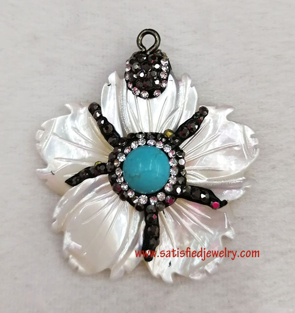 Material: Real shell with crystal stones around Type: New design Size: 38x42mm Middle turquoise size: round flat 8mm Weight: 8.9g MOQ: 20PCS Delivery time: one week