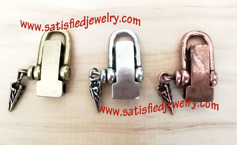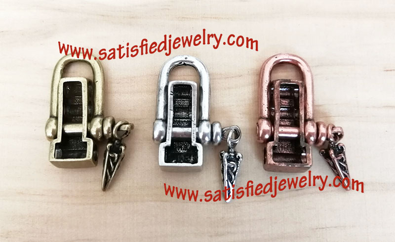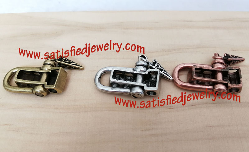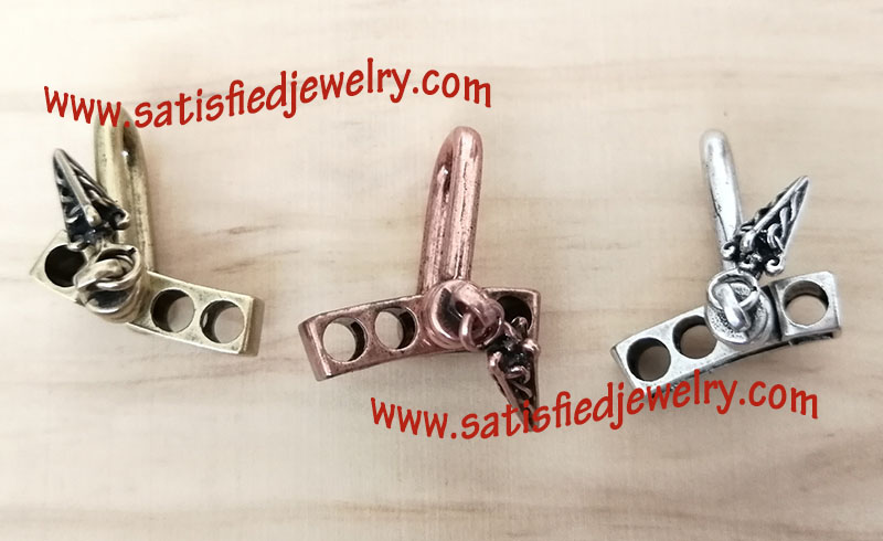 Material: Brass Color: Antique Rhodium color, Antique gold color, Antique rose gold color Size: 28.6x20.8mm, inside diameter of three hole in the side is 3.7mm, size of the pendant is 17.7x6.1mm Weight: 7.8g/piece MOQ: 50PCS each color Delivery time: one week