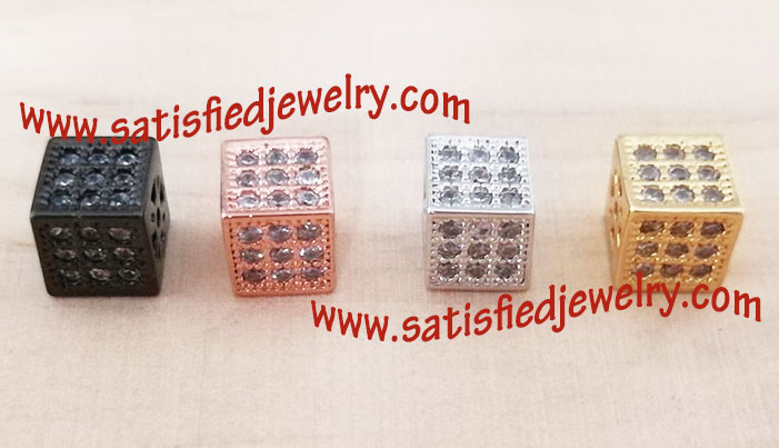 Material: Brass material with real gold plated, with cubic zircon Color: Gold plated, Rose gold plated, Black color, Rhodium plated Size: 6.3x6.3x5.9mm, the hole inside diameter is 1mm Weight: 0.9g/piece MOQ: 50PCS each color Delivery time: one week