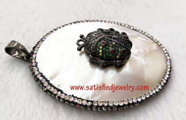 Material: Real shell with insect with cubic zircons Size: 57.5x45.5mm Weight: 22.1g Insect size: 20.5x18mm MOQ: 20PCS Delivery time: one week