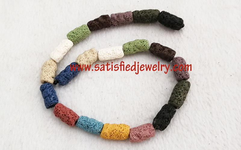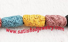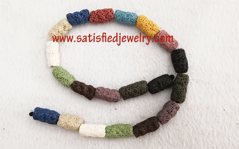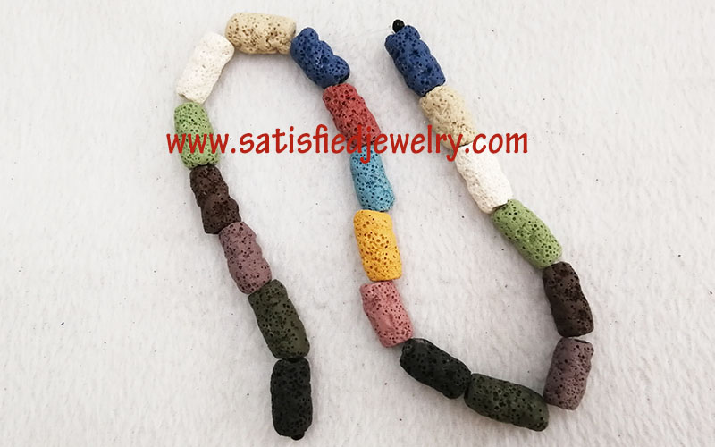Material: Lava Color: as show in the color card below Size: diameter 6.6mm - 11.5mm, length 19mm - 24.5mm, one string with 20pcs MOQ: 100strs/size/color Delivery time: one week