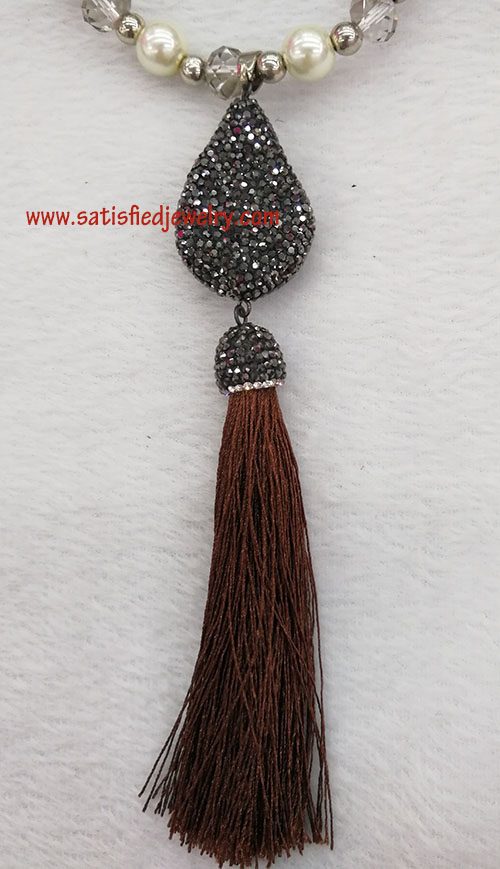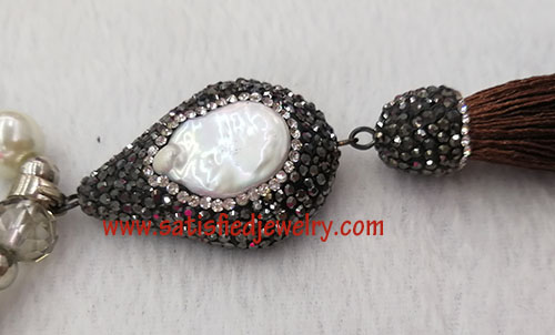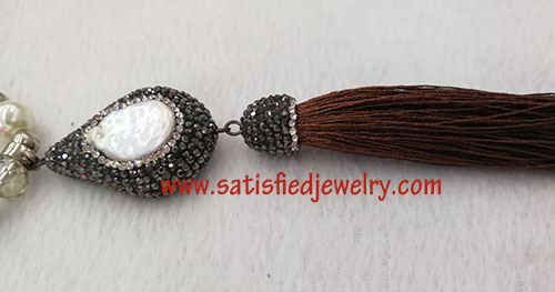 Material: Real shell beads with tassel and with crystal stone around shell beads with crystal beads Size: 44mmx26mmx12mm(depth) Tassel size: 80mm MOQ: 50PCS Delivery time: one week