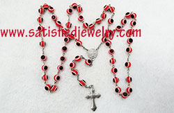 Material: plastic beads + iron rings + Alloy pendant Size: 8mm plastic beads, middle alloy pendant size is 16x16mm, the below cross pendanty size is 34.4x21.3mm , total length is 55cm, only the chain length is 80cm MOQ: 2000pcs/color Delivery time: 10days