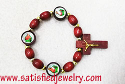 Material: wood + gold color plastic beads Size: 9.6x8mm wood beads, 13x12.6x6.3mm wood round beads, 28x18.8x4.3mm wood cross pendant, 3.8mm plastic round beads with gold color MOQ: 2000pcs/color Delivery time: 10days