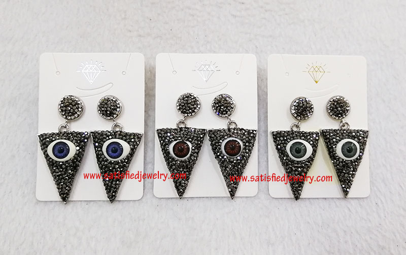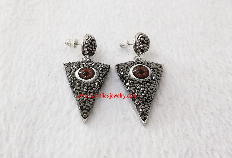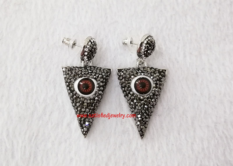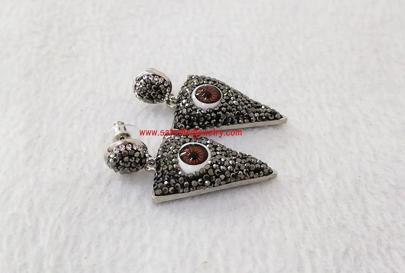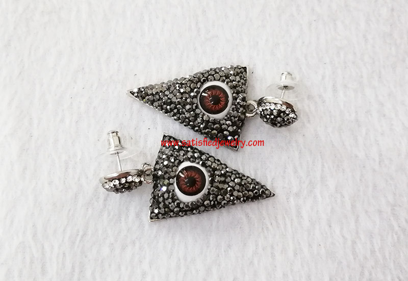 Material: brass + stones Size: the pendant below size is 37.5x24.5x10mm, the round stone part is 12mm MOQ: 100pairs/color Delivery time: one week