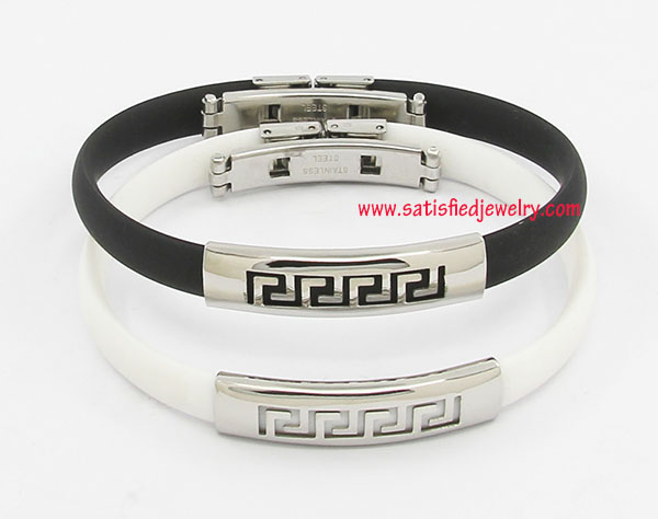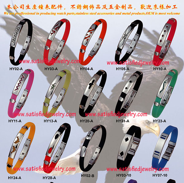 Material: Stainless steel + genuine silicone Color: 17designs with 20colors to choose Size: length is 20.5cm (22cm), width is 8mm, depth is 3.5mm, inside diameter is 5.6cm, the middle steel part size is 36X9MM, the inside hole size is 8x3mm MOQ: 100pcs / color / design Delivery time: one week