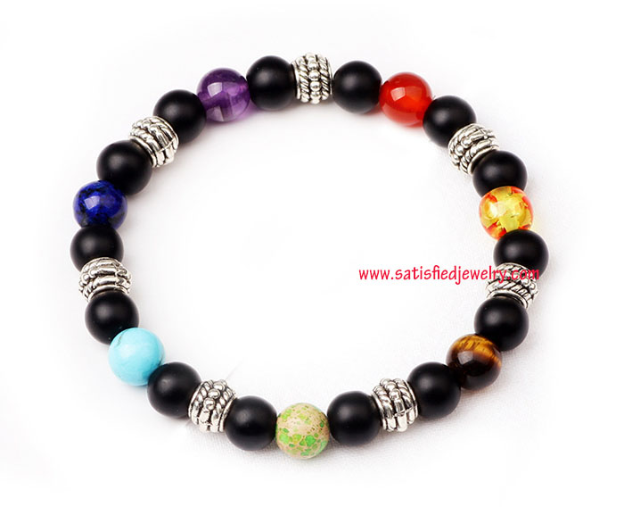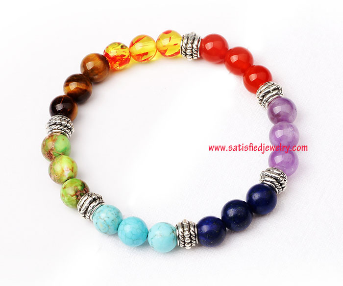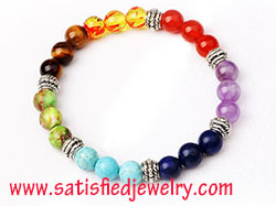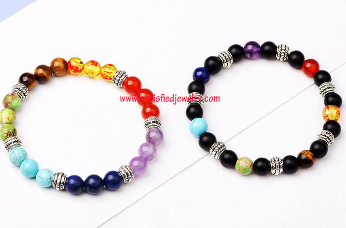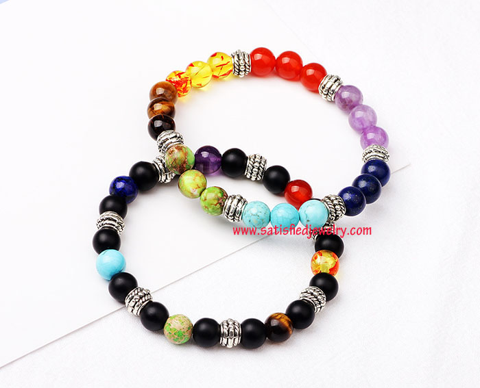 Material: colored gemstone beads + alloy parts Color: two colors - all colored gemstone beads / colored genstone beads + black agate matt Size: 8mm gemstone beads, diameter is 6cm Weight: 20g MOQ: 120pcs/color Delivery time: one week