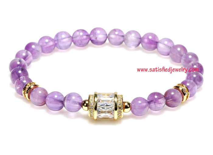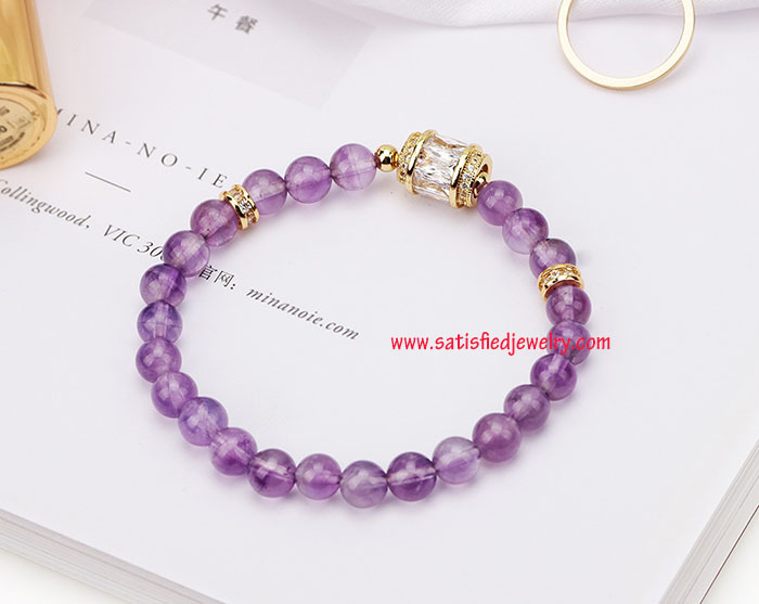 Material: Amethyst + middle brass spacer with cubic zircon stone Color: one color as show in the photo Size: 7mm Amethyst round beads Weight: 14g MOQ: 120pcs/color Delivery time: one week