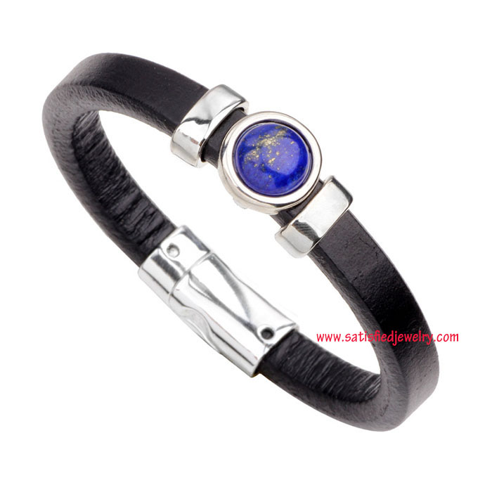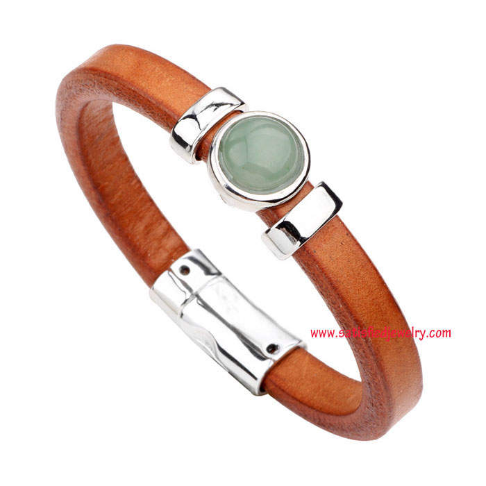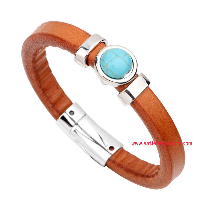 Material: Leather + alloy parts Color: dark brown + tiger eye / dark brown + lapid / light brown + turquoise / light brown + black agate / light brown + aventurne Size: length is 23.5cm, width is 1cm Weight: 31g MOQ: 120pcs/color Delivery time: one week