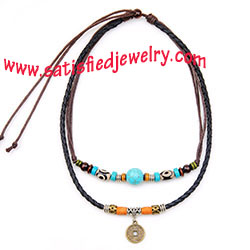 Material: Leather + alloy parts + turquoise + wood beads Color: as show in the photo Size: length is 20cm, with 1cm extend line Weight: 17g MOQ: 120pcs/color Delivery time: one week