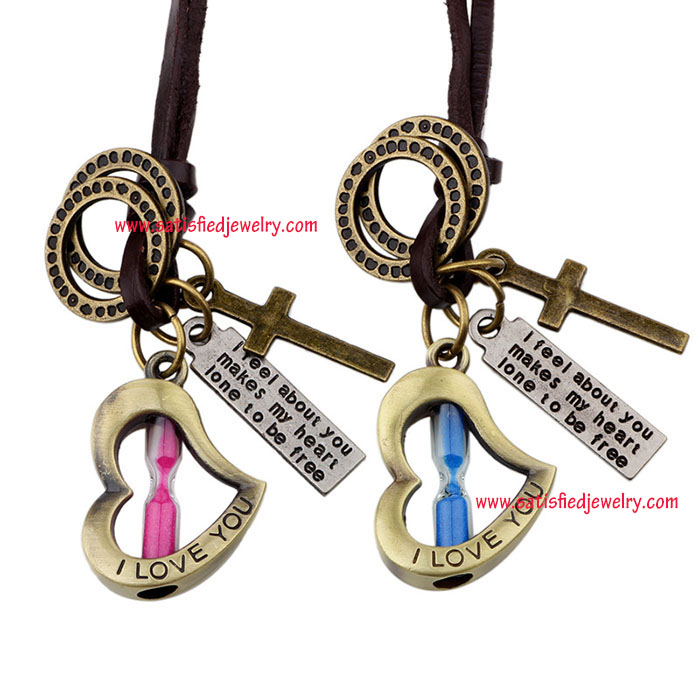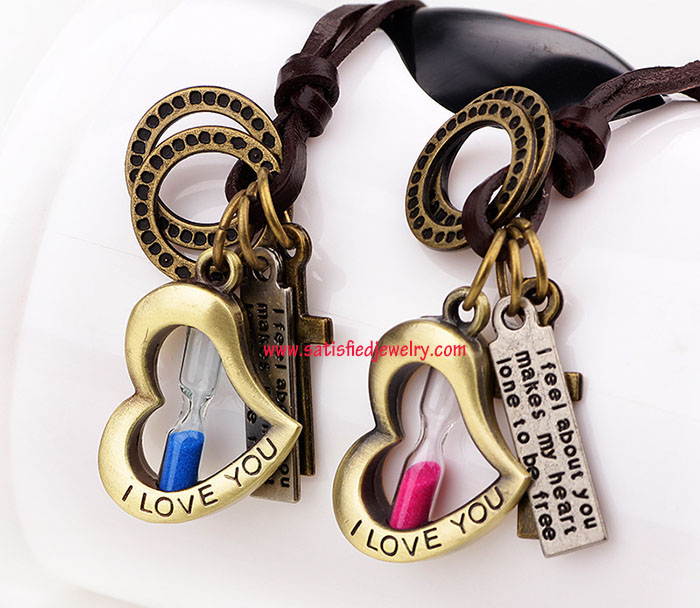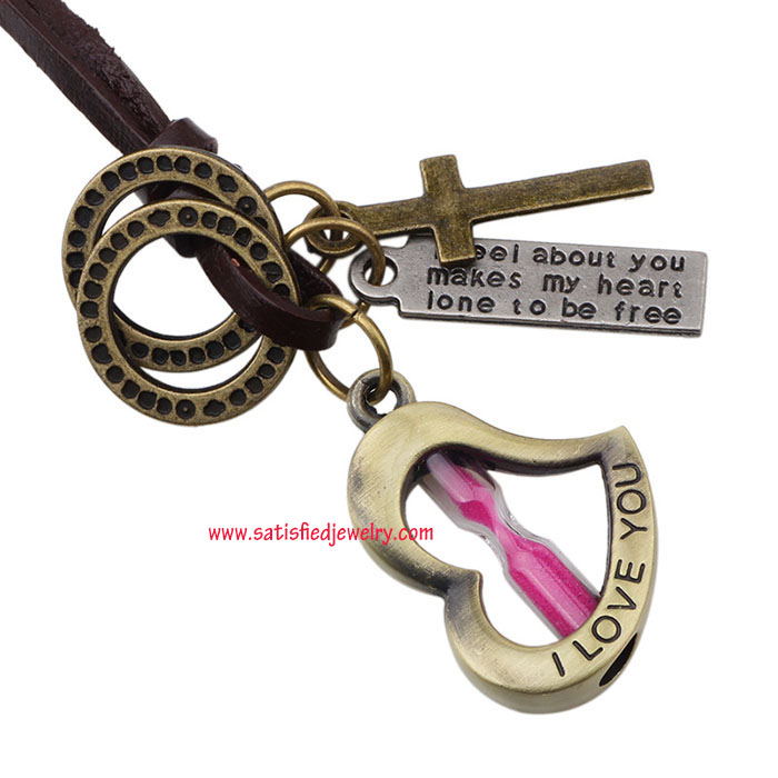 Material: Leather + alloy parts + hour glass Color: pink sand / blue sand Size: Leather rope perimeter is 72cm Weight: 20g MOQ: 120pcs/color Delivery time: one week