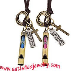 Material: Leather + alloy parts + hour glass Color: pink sand / blue sand Size: Leather rope perimeter is 72cm Weight: 20g MOQ: 120pcs/color Delivery time: one week