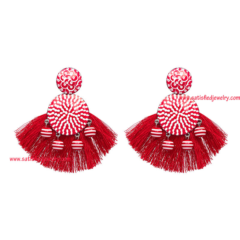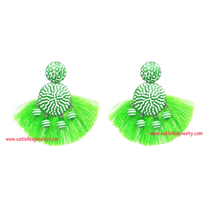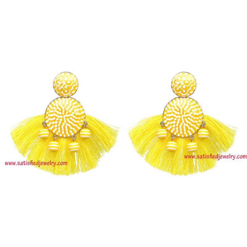 Material: Tassel + alloy parts Color: fuchsia / red / green / yellow / blue / black Size: 10.5x9cm Weight: 36g MOQ: 120pairs/color Delivery time: one week